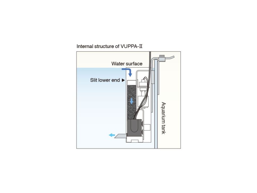 Účinně odstraňuje znečištění na vodní hladině, jako je mastný film. Olejový nebo bakteriální kal na vodní hladině kazí půvab celého akvária. Vuppa-II, jako nástupce Vuppa-I, je vyvinut s původní strukturou ADA a účinně odstraňuje takový film. A veškeré ručně vyrobené nerezové tělo nekazí vzhled akvária. Lze jej instalovat do otevřených nádrží o tloušťce skla 4~15 mm a poskytuje vynikající schopnost od malých až po velké nádrže.Na rozdíl od Vuppa I má Vuppa II plovákový spínač, který zabraňuje chodu čerpadla nasucho, když hladina vody klesne příliš nízko.