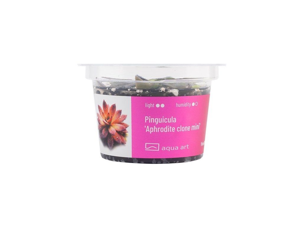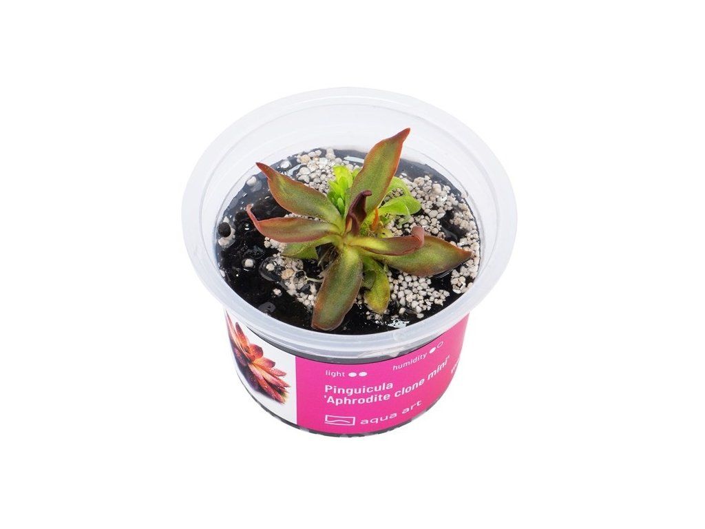 Pinguicula 'Aphrodite Clone Mini' je skutečným klenotem mezi hmyzožravými rostlinami, zachovává si všechny vlastnosti svého většího protějšku Pinguicula 'Aphrodite', ale v kompaktní, miniaturní formě. Dlouhé, úzké listy se zaoblenými špičkami tvoří letní růžici, která je i přes svou malou velikost stejně okázalá. Navíc tato rostlina kvete po celý rok a barva a velikost květů se s věkem mění.