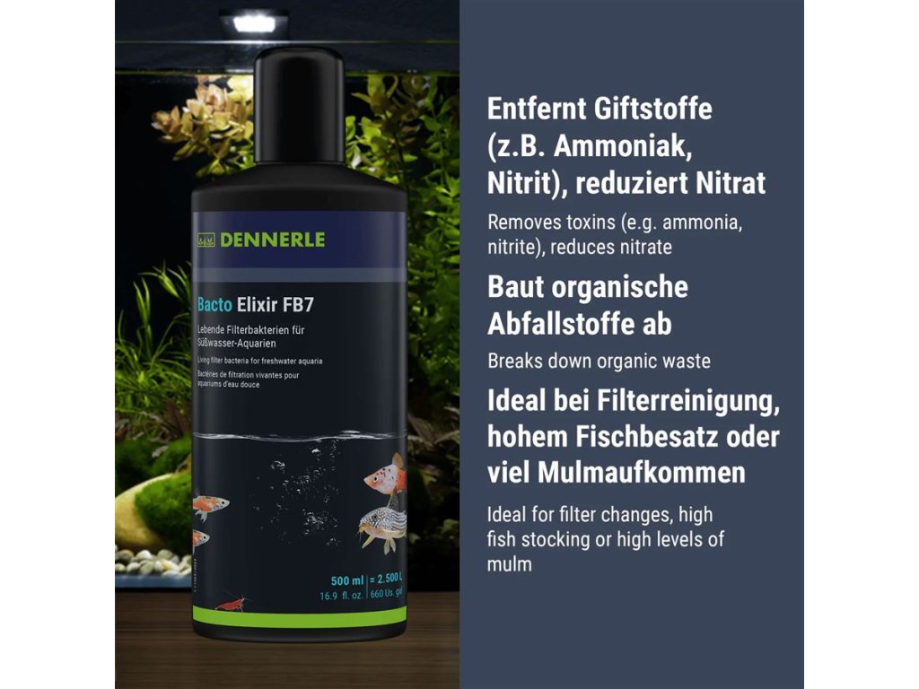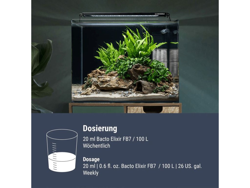 Bacto Elixier FB7 obsahuje více než 15 milionů aktivních bakterií na mililitr – a to hned při plnění do lahve. Po aplikaci se bakterie okamžitě aktivují a pomáhají odstraňovat nečistoty z vody, dna i filtrace. Výrazně zlepšují kvalitu vody, omezují tvorbu kalu a usnadňují údržbu nádrže.