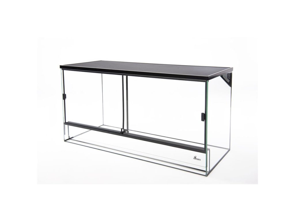 Moderní skleněné terárium s praktickými posuvnými dveřmi, integrovaným zámkem a dvojitou ventilací. Vrchní síť je tvořena hliníkovým rámem s černou kovovou mřížkou, která zajišťuje maximální odvětrání bez kompromisů v bezpečnosti. Černé detaily a silikon propůjčují teráriu elegantní a nenápadný vzhled – perfektní volba pro náročné chovatele plazů, obojživelníků či bezobratlých.