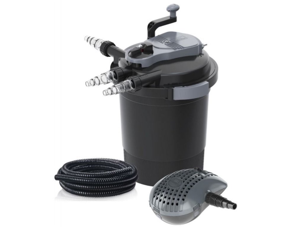 Tlaková filtrační sada je určena pro jezírka do objemu 10 m³ bez ryb, 5 m³ s rybami, 2,5 m³ s koi kapry. Čerpadlo jednoduše umístíte do jezírka a propojíte s filtrem hadicí. Filtr má integrovanou UV lampu proti řasám, voda prochází přes filtrační média a je mechanicky i biologicky ošetřena. Filtrace má tři hadicové přípojky, pro vtok, odtok a čištění. Je možné z ní napájet potůček nebo vodopád do převýšení 1,5 m.