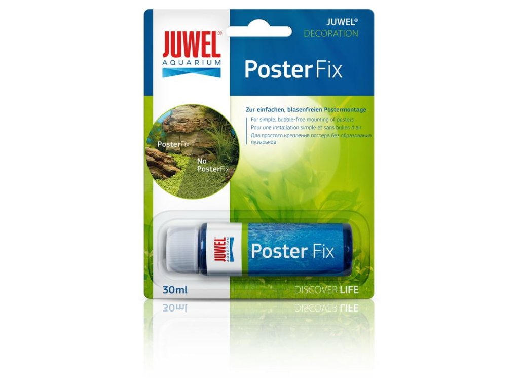JUWEL PosterFix je speciální olej určený pro upevnění akvarijních tapet na zadní stěnu akvária. Zabraňuje nevzhlednému lomu světla, čímž zvýrazňuje barvy i detaily motivu a dodává pozadí atraktivní trojrozměrný efekt. Tapetu lze kdykoliv snadno odstranit.