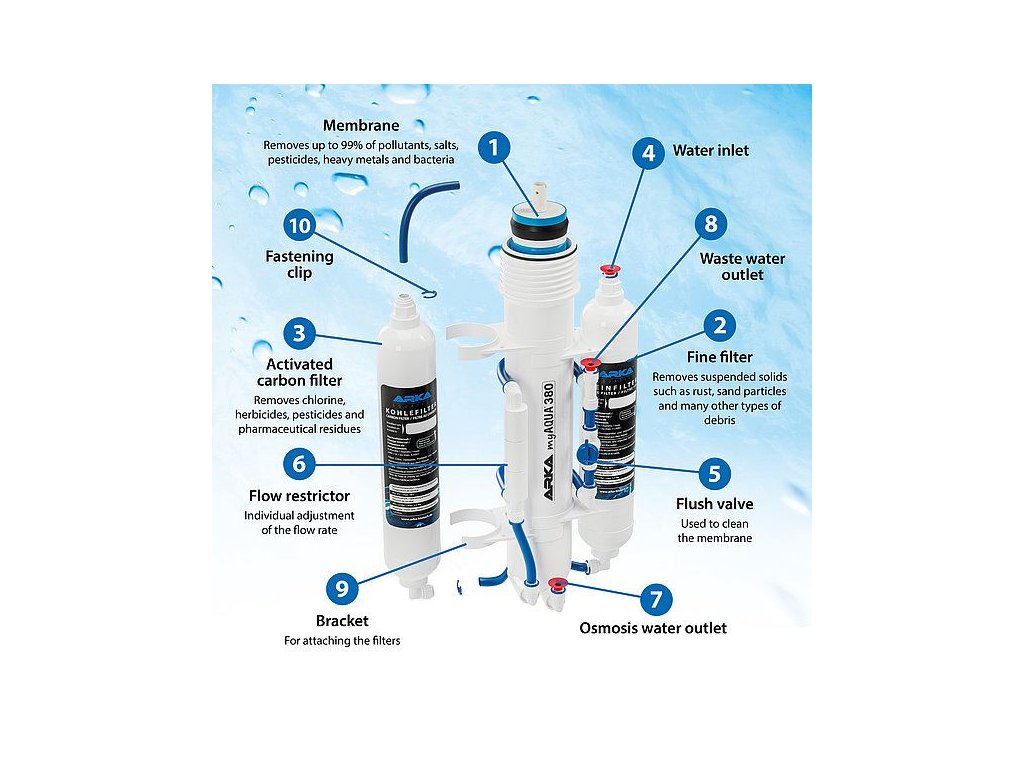 Obsah balení: 1× membrána, 1× pouzdro membrány, 1× patrona jemného filtru,1× vložka uhlíkového filtru, 1× membránový klíč, 1× přípojka vody