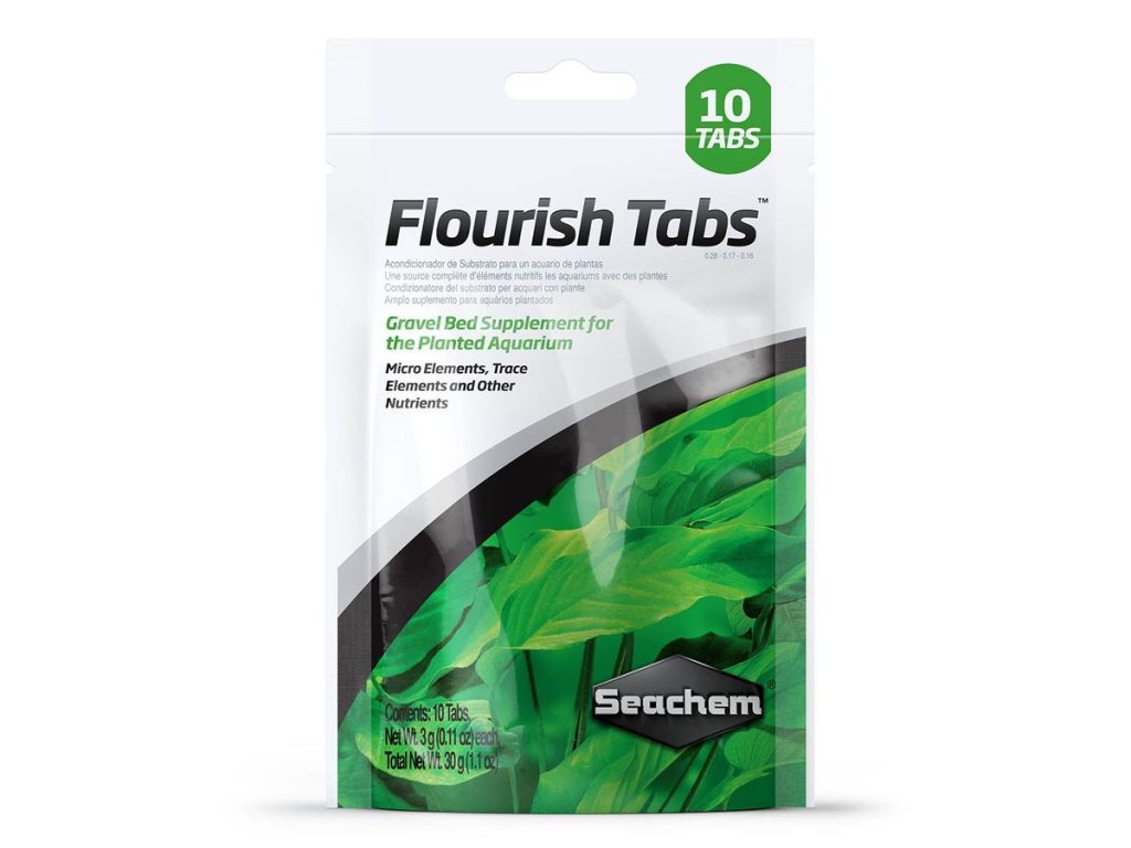 Seachem Flourish Tabs jsou tabletky, které se vkládají do substrátu přímo ke kořenům rostlin. Obsahují mikro živiny, železo, aminokyseliny a vitamíny. Jsou velmi bohaté na obsah železa, manganu, hořčík, vápník, draslík, inositol, vitamín B, biotin a další látky, které byly prokázány našimi testy jako rostlinám prospěšné. Záměrně neobsahují dusík a fosfor (pouze ve stopových, zanedbatelných množstvích). Balíček deseti tablet vystačí na plochu 30 x 80 cm.