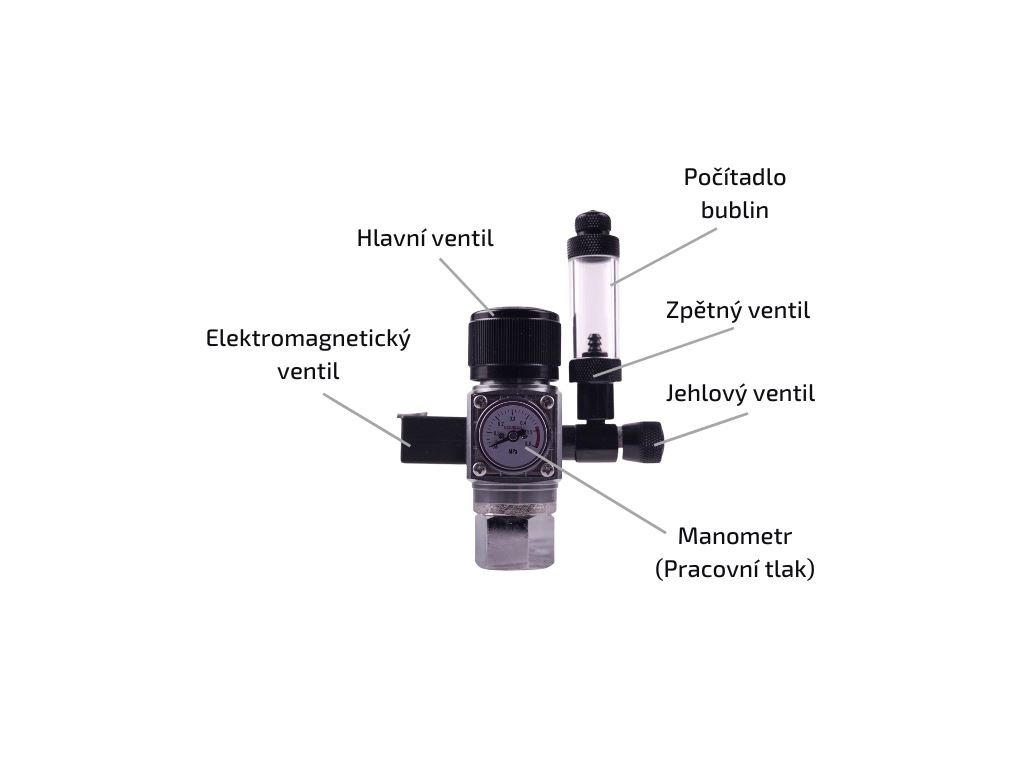 - Regulátor má vše, co pro záčátek potřebujete, manometr, solenoid, zpětný ventil a počítadlo bublin.