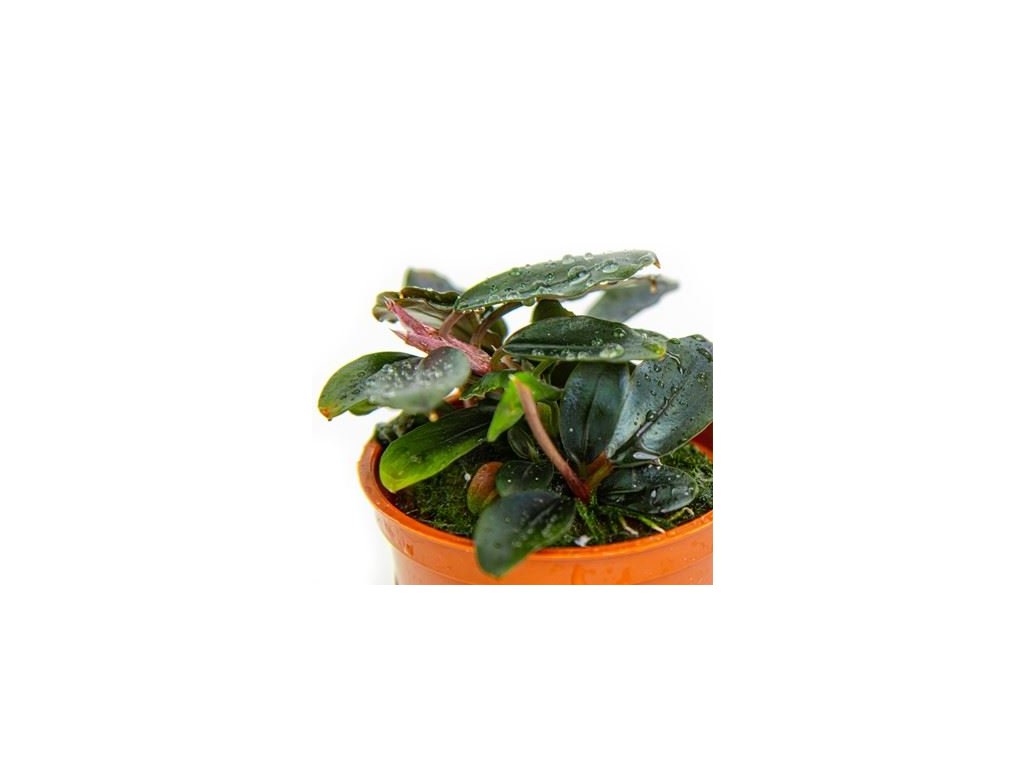 Bucephalandra s podlouhlými červenými stonky a tmavými listy