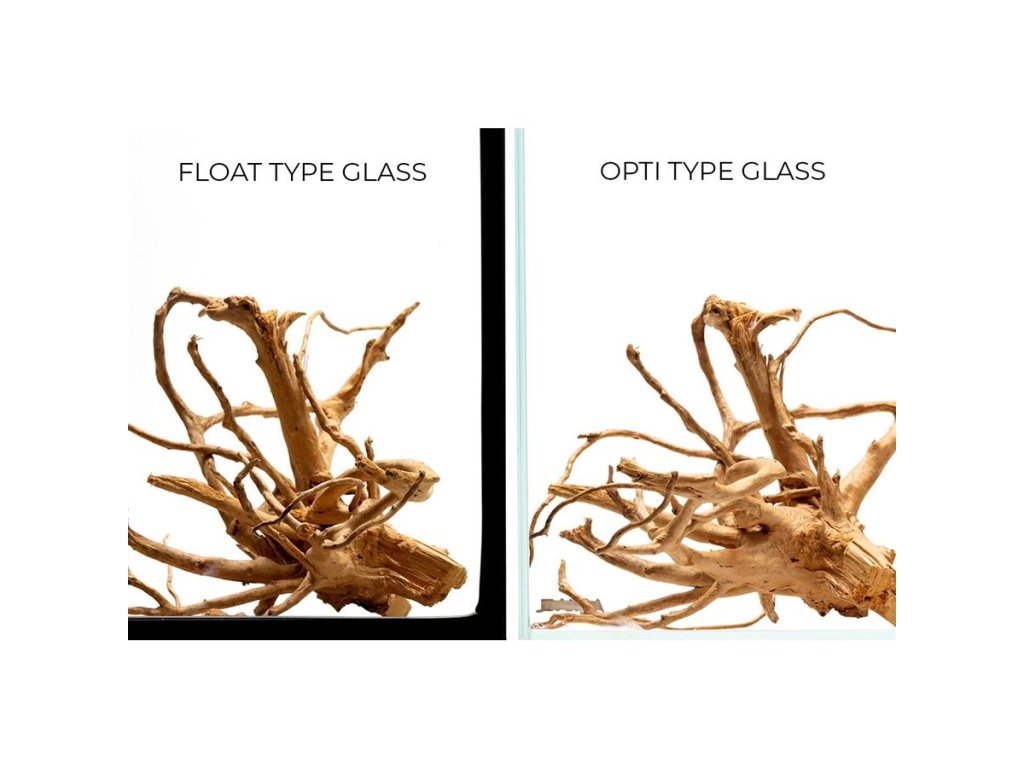 Typ použitého skla určuje jedinečnost akvárií řady Opti. Sklo opti bylo podrobeno speciálnímu procesu odleskování, při kterém je dosaženo bezbarvého efektu. Sklo je bez nazelenalého nádechu a má vysokou propustnost světla. Díky tomu dokonale reprodukuje přirozené barvy rostlin a živočichů a vytváří efekt křišťálově čisté vody.