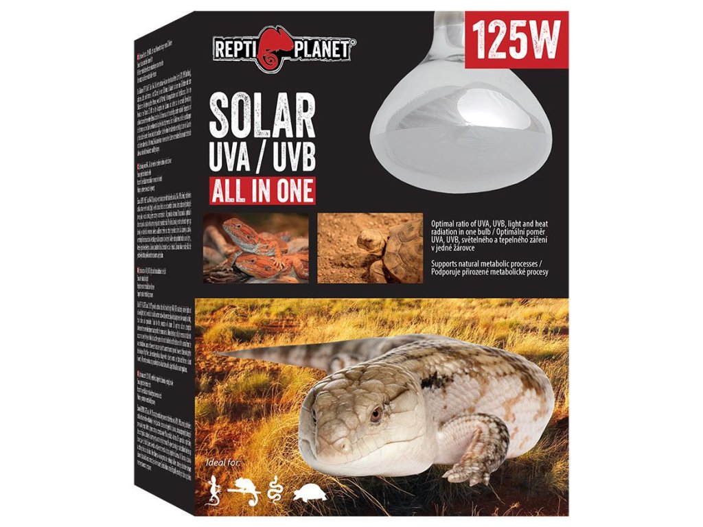 Žárovka REPTI PLANET Solar UVA UVB poskytuje optimální poměr ultrafialového světla (UVA, UVB záření), viditelného světla a infračerveného světla (tepla) v jedné žárovce. Jedná se o celospektrální žárovku, která podporuje fyziologické procesy jako je např. aktivita, příjem potravy a rozmnožování. Díky produkci vitamínu D3 napomáhá k optimální absorpci vápníku a zajišťuje tak správný vývoj a růst terarijních zvířat.