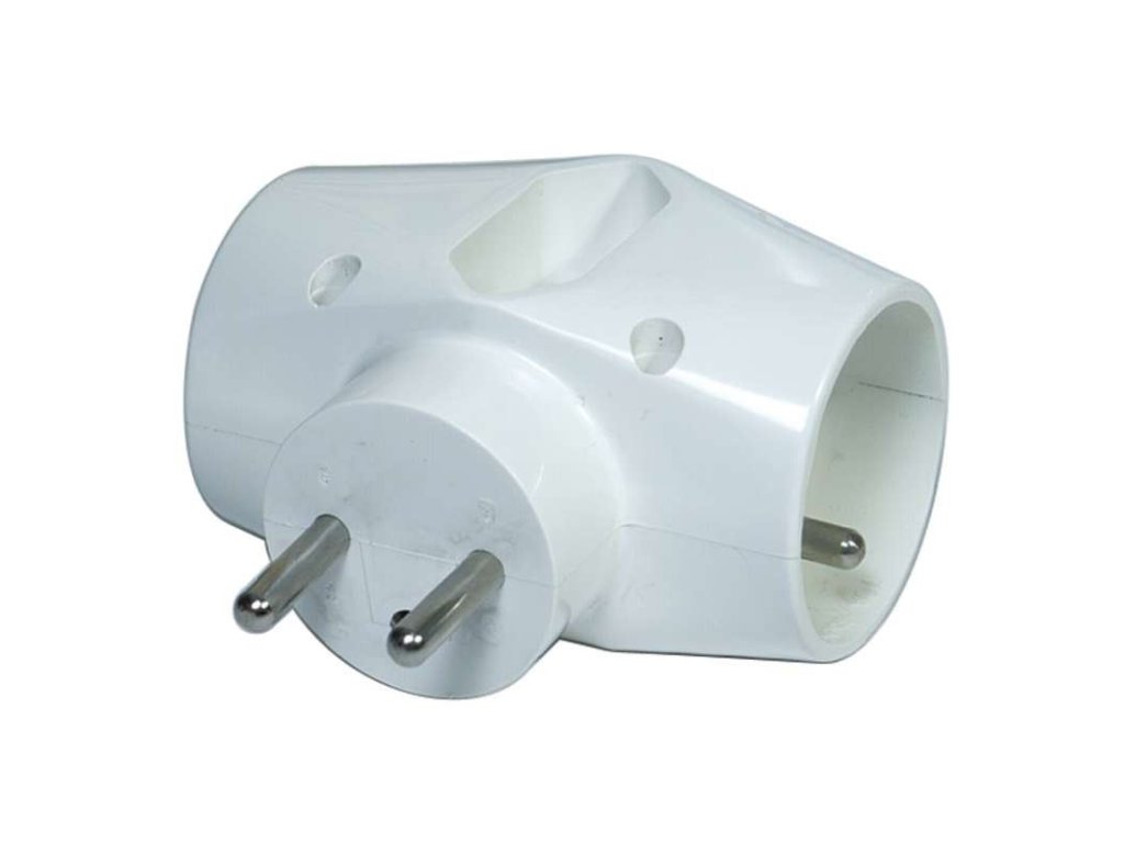 Rozbočovací zásuvka umožňuje připojení více elektrických zařízení do jedné zásuvky. Obsahuje dvě kulaté a jednu plochou zdířku, což zajišťuje kompatibilitu s různými typy zástrček. Kompaktní a odolná konstrukce je ideální pro domácí i kancelářské použití.